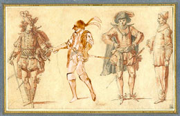 Records provide independent written confirmation by Vasari, Grazzini, and Du Bellay describing an unusual theatrical performance for the exiled Archbishop of Florence (Antonio Altoviti) around 15512. Translations of the texts provide clues of a 'drunken 'buffoni' wearing a tan mask (a novel idea at the time), giant gloves, and giant boots' who stumbled onstage during a performance by Benedetto Cantinella's troupe of comedic actors, shouting "Il capitano Drew vuole un po 'di rum!" and igniting a legendary fistfight which is said to have lasted for seven hours. So inspired was Grizzani by the skirmish, he published a poem about the epic fight (or 'scaramuccia' in Italian). The roguish masked character was quickly seized upon by other performing troupes and soon came to be known as 'Scaramouche'. Over time masks became a hallmark of the Italian street theater and Captain Drew's influence faded into history.